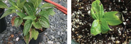Pictured: Rudbeckia (left) and zinnia infected with leaf spot diseases. Symptoms tend to appear on lower leaves first since they remain wet the longest following irrigation. Photo courtesy of Univ. of Md. Extension