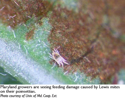 Univ. of Md. Coop. Ext. specialists first began finding Lewis mites on poinsettias in 1996. This year they are receiving plant samples with foliage damage caused by the mites. The mites are found primarily on the undersides of leaves. They have a similar color as two-spotted spider mites, but Lewis mites are smaller and narrower with several small, greenish spots. Feeding symptoms are subtle so early detection of a Lewis mite infestation is difficult. Feeding appears as faint flecking or stippling of the foliage, which causes a chlorotic appearance as plants mature. As populations increase, the upper leaves begin to turn brown. The mites form webbing around the growing tips on which they gather and seek to gain altitude in order to be blown or move to new feeding areas. Controls that extension personnel have found to be effective include Floramite, Sanmite, Akari, Judo, Pylon and Avid.