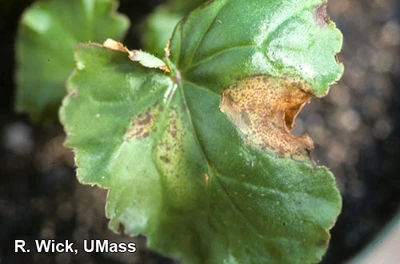 Bacterial leaf spot on begonia is caused by a Xanthomonas that can only infect plants in the genus Begonia. It is a different pathovar of Xanthomonas than the one that infect geraniums (X. axonopodis pv. Pelargonii), that causes bacterial wilt of geranium. There are many different types of begonias, most of which can be affected, although they vary somewhat in susceptibility. The diagnostic test kits for the Xanthomonas on gernium cannot be used to detect the Xanthomonas on begonia.