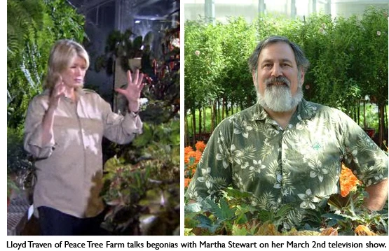 Lloyd Traven of Peace Tree Farm in Kintnersville, Pa., will be on the Martha Stewart Show on March 2 to talk about heirloom begonias and how consumers can care for them. Stewart is amazed at how big the leaves can get on some of the plants. Check for your local TV listing and show time. If you can’t catch the show on Tuesday, an online video of the show is available.