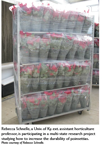 Although some consumers might feel that their poinsettias already last long enough, research is underway to improve the plant’s durability in both the retail and consumer setting. Rebecca Schnelle, a Univ. of Ky. ext. assistant horticulture professor, is participating in a multi-state research project studying how to deliver the plants from the grower to the consumer in the best shape possible.