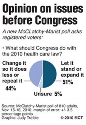 A post-election McClatchy-Marist survey of registered voters found that a majority of Americans want to keep the new 2010 health care law or want the law expanded. The survey of 1,020 adults was conducted Nov. 15-18. 51% of those surveyed want to keep the law or change it to do more. 44% said they wanted to change the law so that it would do less or they wanted to repeal it altogether. 65% of the survey respondents said the law’s mandate requiring every American to buy insurance was unconstitutional, while 29% said the mandate should be kept.
