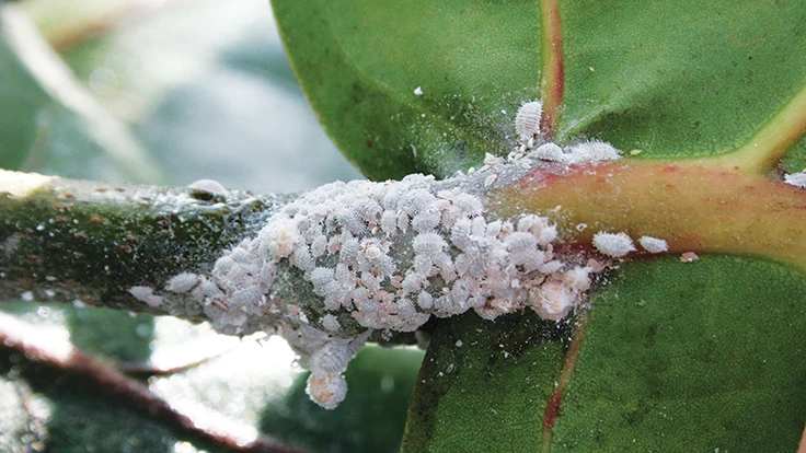 Mealybugs begin as orange-yellowish crawlers, but as they mature, they develop a waxy coating and become white, Cloyd says. “They’re kind of elliptical,” he adds. “[And] you’ll see fringes on the outer edge of the body.”