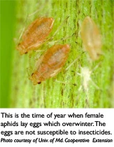 At this time, female aphids lay eggs which overwinter. Univ. of Md. Coop. Ext. personnel said aphids in the egg stage are not susceptible to insecticides. In the fall, males are produced that mate with females. During most of the year, aphids can reproduce parthenogenically (females do not mate and give birth to more females). Aphids can give birth to females that are ready to give birth to more aphids. This enables aphid populations to build up very quickly. Winged forms can be produced when populations are high to allow aphids to disperse to new plants or crops.