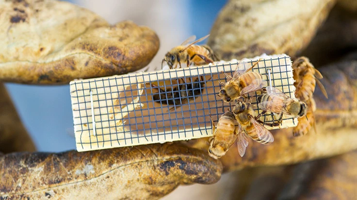 A queen bee is kept in a seperate box until she and the workers are added to the new colony. MSU photo by Kelly Gorham.