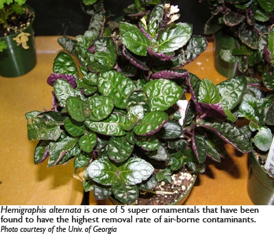 Univ. of Georgia researchers have shown that certain plant species can effectively remove air-borne contaminants, including harmful volatile organic compounds (VOCs). Of the 28 plants tested, the researchers identified 5 “super ornamentals,” which had the highest rates of contaminant removal, a process called phytoremediation. The plants included: Hemigraphis alternata (purple waffle plant), Hedera helix (English ivy), Hoya cornosa (variegated wax plant), Asparagus densiflorus (asparagus fern) and Tradescantia pallida (purple heart plant). The plants were exposed to a number of common household VOCs, including benzene, toluene, octane, alpha-pinene and TCE.