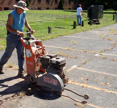 Pictured: Ohio State University associate professor Joe Kovach cuts trenches for his parking-lot urban garden test site in Wooster, Ohio..
