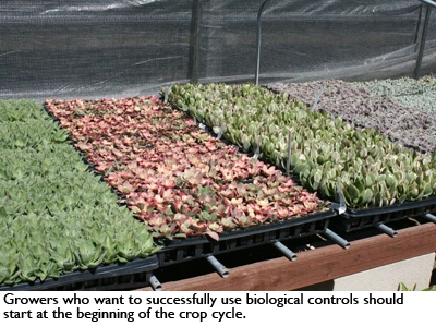 Growers who want to successfully use biological controls with their spring crops should start at the beginning of the crop cycle in the propagation house. Never start using biological controls in the middle of a crop cycle.
