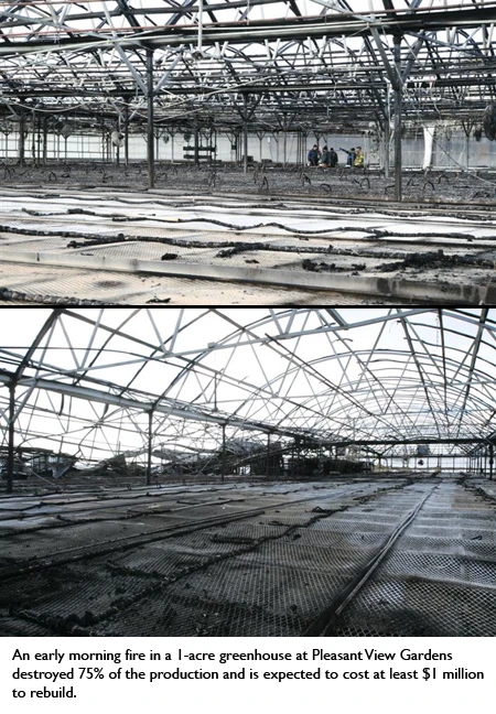 An early morning two-alarm fire on Jan. 21 at Pleasant View Gardens in Loudon, N.H., destroyed a 1-acre greenhouse range. The greenhouse that was destroyed was one of the company’s oldest and 11 acres still remain. The company was able to salvage about 25% of the production space and expects to have it up and operating within a few weeks.