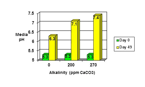 How does water alkalinity influence the pH of the growing medium? In Figure 1 below, vinca plugs were grown for 49 days and constant fed at 125 ppm with 13-2-13 (a potentially basic, plug fertilizer). The plugs were irrigated with one of three water sources with varying alkalinities. The pH rose in all three media samples, not only due to the 13-2-13 and limestone in the growing medium, but also from the alkalinity of the water source. In this example, the higher the alkalinity, the higher the pH of the growing medium rose.