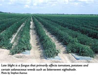 Late blight is a fungus (Phytophthora infestans) that primarily affects tomatoes, potatoes and certain solanaceous weeds such as bittersweet nightshade.