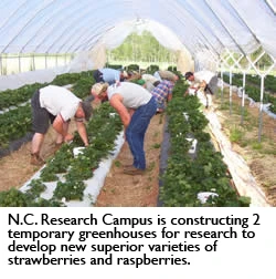 The temporary greenhouses, which are expected to last 20 years, will remain part of the overall operation. They will be similar to a greenhouse that already exists at the university’s Piedmont Research Station in Salisbury. The Piedmont greenhouse is used for research on developing new, superior varieties of strawberries and raspberries. Breeding work includes evaluation of plants for yield, adaptability, flavor and appearance.