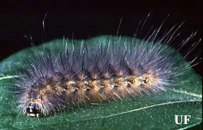 Young larvae are yellowish white becoming more reddish brown as they grow. The larvae skeletonize the foliage and there may be large holes in the leaves. Also, look for caterpillar droppings (frass). Adults are fairly large white moths with many small black spots.