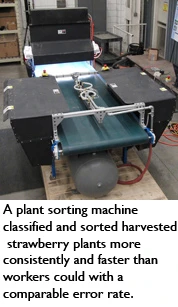 Liz Ponce, CEO of Lassen Canyon Nursery in Redding, Calif., is looking forward to using a plant sorting machine developed by researchers at Carnegie Mellon Univ.’s Nat’l. Robotics Engineering Center. The machine uses computer vision and machine learning to inspect and grade harvested strawberry plants. It then mechanically sorts them by quality. These tasks could previously be done only manually.