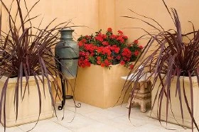 Water-wise plants will also make the Mediterranean garden style (above) hot in 2012, said Genevieve Schmidt, a northern coastal California landscape designer and author of the North Coast Gardening blog. Mediterranean landscape design, she explained, often features open and airy courtyards, light-colored, textured hardscaping such as mosaic walls, gravel beds or unglazed terra cotta pots and low-growing, drought-tolerant plants, hedges, topiary trees and vines (i.e. olive, bay and lemon trees, succulents, lavender, palms, roses and grasses). “Of course, the vivid colors also help make this a winning style.”