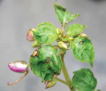 Pictured: Impatiens necrotic spot virus symptoms on impatiens.