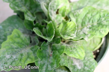 Pictured: Powdery mildew on gerbera. Photo by Leanne Pundt, Univ. of Conn.
