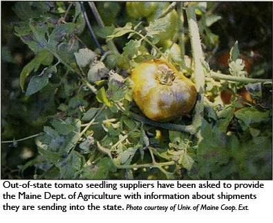 In a letter to tomato seedling suppliers state horticulturalist Ann Gibbs said Maine experienced a dramatic increase in late blight (Phytophthora infestans) outbreaks on tomato and potato crops last year. In the letter she wrote the disease was traced to tomato seedlings from out of state sources sold at retail outlets statewide. She said the infested seedlings contributed to the increased incidence of the disease.