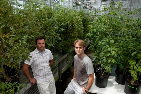 Pictured: Univ. of Fla. researchers Max Teplitski (left) and Jason Noel are screening tomato varieties to determine which ones are most resistant to salmonella.