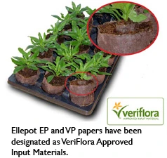 Two types of degradable papers used by Ellepot-USA in its cutting and seed propagation system have been listed as VeriFlora Approved Input Materials. The Ellepot propagation system offers an alternative to plastic containers with its EP or VP paper with reusable trays. The Ellepot is suitable for a variety of flowering and vegetable plants and other nursery products. One roll of paper is equivalent to about 17,000 4-inch pots. One pallet of paper holds 32 times that, or 540,000 pots, taking up much less space and weight on a pallet, allowing greater efficiency in transportation. The Ellepot reduces the amount of growing medium needed and avoids root shock when transplanting by keeping the medium secured around the root system.