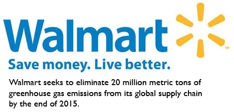 Walmart plans to eliminate 20 million metric tons of greenhouse gas emissions from its global supply chain by the end of 2015. This represents 1½ times the company's estimated global carbon footprint growth over the next 5 years and is the equivalent of taking more than 3.8 million cars off the road for a year.