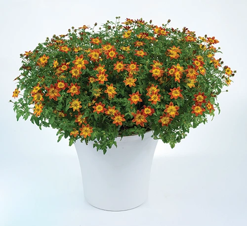 Bidens ‘Blazing Glory’ has single or semi-double flowers that are sun and heat lovers, but can also handle cold temperatures. Performs well in mixed containers, pots, hanging baskets and flowerbeds. There are three new varieties with specific features: large orange-yellow flowers, extra-large golden flowers and extra-large yellow flowers.