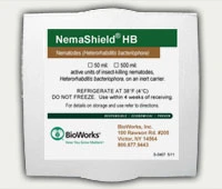 NemaShield HB from BioWorks Inc. is an insecticide that contains the beneficial nematode Heterorhabditis bacteriophora, which provides control of vine weevil larvae (including black vine weevil), cutworms, leatherjackets, white grubs, banana moth and other caterpillars. An effective alternative to chemical controls in managing larvae of soil and boring insect pests. One 50 million unit of NemaShield HB (sprayable formulation) contains 50 million infective Heterorhabditis bacteriophora on an inert carrier and will treat up to 2,000 square feet.