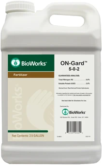 ON-Gard is an innovative fertilizer that is 100 percent plant-derived, 100 percent water soluble, and consistent in composition. ON-Gard increases stress tolerance (extreme heat, drought or high salts), increases plant/crop/turf growth and enhances nutrient uptake and overall absorption. It is rapidly absorbed by leaves and roots and transferred throughout the plant. ON-Gard can be applied as a foliar spray, root drench or root dip. It is suitable for use on all plants.