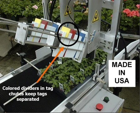 The Rapid Automatic Tagger from Blackmore Co. can be used for both small and large runs. Preloading its tag chutes using colored dividers enables the tagger to be used with shorter batch runs. The standard tagger with an optional third head can do up to 700 flats in one hour. This unit has a built in conveyor for stand-alone or in-line tagging.