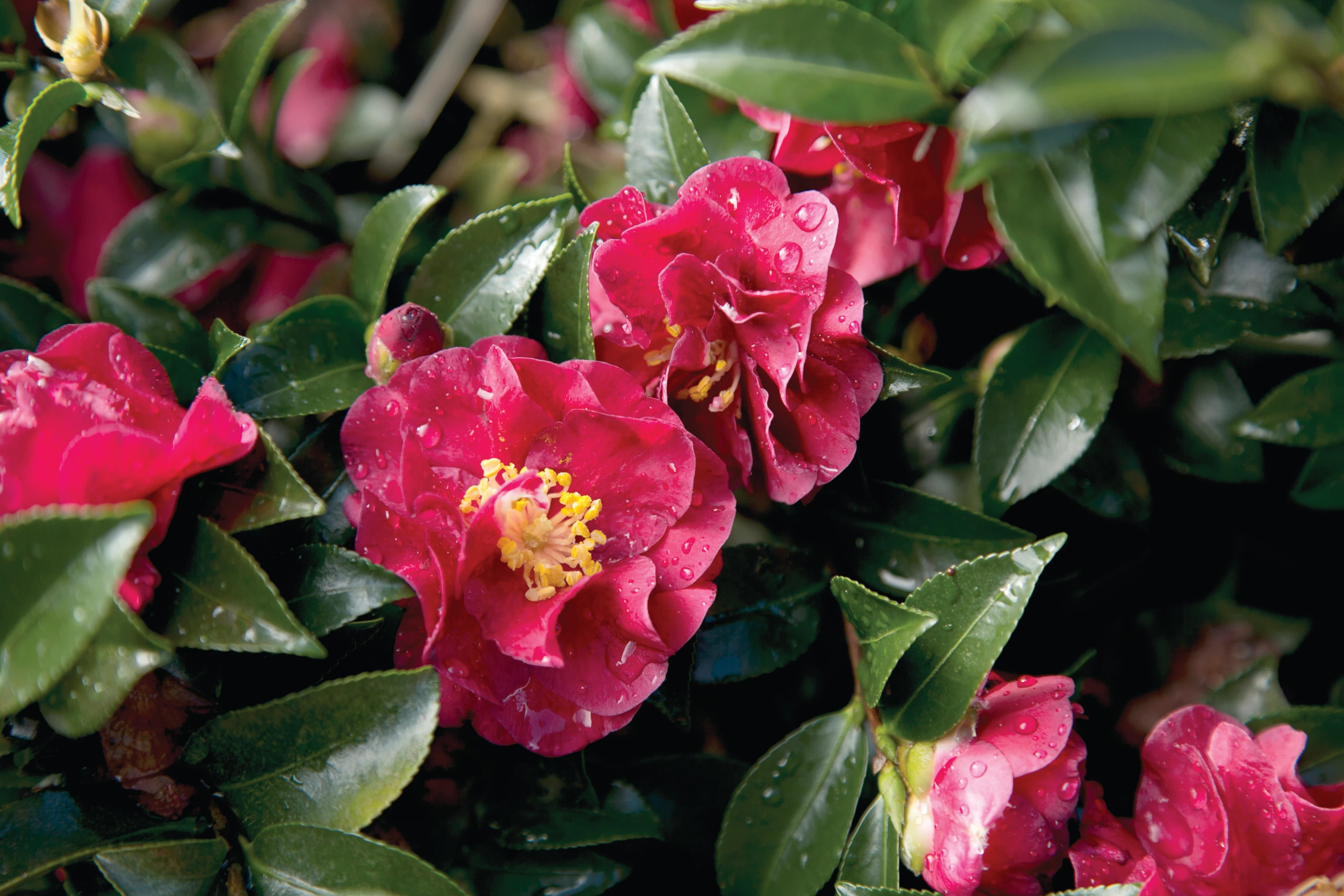 Camellia hiemalis October Magic ‘Ruby Camellia’ from Southern Living Plant Collection is a festive Christmas red with fully double blooms that decorate the deep green, super glossy foliage on this compact plant. Ruby can be used as an accent plant or as a hedge. Blooms in fall. Full sun to part shade. 4 to 5’ high by 4 to 5’ wide. Hardy to USDA Zones 7 to 9.