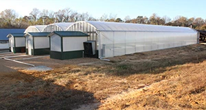 The Gutter-Connected Greenhouse is a series of 22-feet wide bays connected to the next bay by an aluminum gutter and expandable by adding on more bays as your business grows. 16 Bays (352 feet wide) equals approximately 1 acre. The column posts, which support the gutter are spaced 8 feet on center. Our standard greenhouse is 128 feet long. This is an engineered structure with a 90-mph wind load rating, and that wind load rating is increased to 130 mph when the cover is removed. The frame has a 20-pound snow load when the greenhouse is heated to a minimum of 50 degrees Fahrenheit.