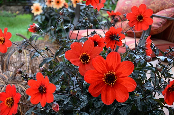The distinctive Mystic Dahlia series feature stylish, more contemporary kind of plants just right for today’s gardens. These beauties are set apart from other Dahlia varieties by their fashionable filigreed deep mahogany to black foliage topped with vivid blooms. Unlike their forebears, they do not require staking. These are strong hardy plants with a profusion of blooms, making consumer success a breeze! Dahlia Mystic Enchantment (‘Another Pet ’) is a lovely bedding or patio plant. It has large fire engine red blooms with elegant central dark discs. It will flower from midsummer until frosts arrive. The large, bold flowers on strong stems make these a perfect border plant or even backyard cut flower with exceptional vaselife.