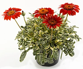 Gazania ‘Gazebra Red’ has large, double, red flowers with complementary variegated (cream and green) cut foliage and a compact habit. This heat-loving variety is drought- and humidity-tolerant and attracts bees and butterflies. It is perfect for bedding, group planting, edging, front of a border, rock gardens, seaside gardens, and mixed or single containers. Jaldety showcased this new variety at the 2014 California Spring Trials.