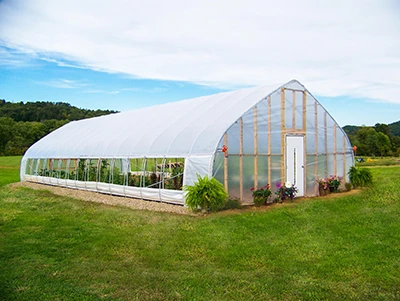 The gothic style arches and high side walls create a very workable greenhouse with no wasted space. Add a lot of production to your produce business with very little cost. Other add ons to this greenhouse include roll up, or down side walls, metal end walls, and roll up or sliding end wall doors.