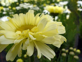 Leucanthemum 'Real Dream' is a summer-blooming perennial with large daisy flowers of three layers of greenish-yellow petals and large golden centers carried on sturdy stems with no staking required. Yellow petals gradually fade to white as the flower matures. This variety is very floriferous with improved disease resistance. A robust drought and wind resistant perennial once established. This superb Shasta Daisy variety is well-behaved with a tight clumping habit. Blooms are excellent for cutting.