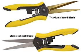 Features 3-inch fine tip blades for precision cutting. Has a spring-action design allowing for quick easy, and accurate trimming and shaping. Made with TPR rubber for a durable and lightweight feel. Comes in yellow for high visibility and is available in Stainless Steel, resistant to corrosion, or Titanium blades, resists sap.