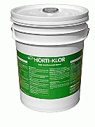 A composite of detergents and emulsifiers, Horti-Klor dislodges stubborn material such as algae, whitewash, oily residues and dirt. The emulsion will not break down during rinsing, thus preventing oily residues which contribute to bacterial growth and off-odors. It produces a high-foam when used in a foam applicator and is safe to use on stainless steel, aluminum, iron, concrete, polyethylene and glass. It contributes 450 parts per million of active chlorine when used at a rate of 2.7 fluid ounces per gallon of water.