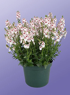 Penhow Diascia 'Aurora White' has branched, pyramidal triangular flower spikes with large individual blooms pure white with a blush pink eye. The Penhow Diascia 'Aurora' series has a unique upright habit. This unusual flower form allows Aurora to have more flower power and be at least two weeks longer-flowering than other Diascia varieties. Aurora's upright habit brings the opportunity for tighter spacing in production, transportation and retail display, and the potential for cost savings that this would allow. In addition, the well-matched series has a good range of strong, bright colors for an outstanding retail display.