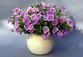 Dark yellow centers stand out from the red-purple veins on this petunia’s medium-sized flowers. Compact with a semi-trailing habit, Blueberry has an early bloom time and can be produced for 10- to 13-centimeter sized pots or for hanging baskets. Petunia Marvel Beauty is also available in Raspberry, which has rose-colored veins on smaller flowers.