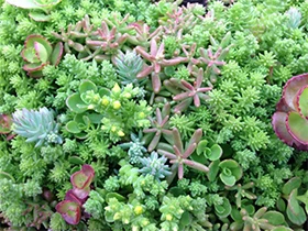 ‘QuickCover’ Sedum is a mix of eight Sedum varieties—Sedum acre, Sedum album ‘Murale,’ Sedum floriferum ‘Bailey’s Gold,’ Sedum kamtschaticum, Sedum sexangulare, Sedum reflexum, Sedum spurium ‘Dragon’s Blood,’ and Sedum spurium ‘Fuldaglut.’ The new sedum mix made its debut at the August 2013 Illinois Landscape Contractors Association Summer Field Day. The shallow one-inch depth of each 12 inch by 24 inch flat and the coarse lightweight media make ‘QuickCover’ Sedum excellent for roofs with weight constraints. This product is compatible with both green roof built-in systems and existing 24 inch by 24 inch green roof modular systems.