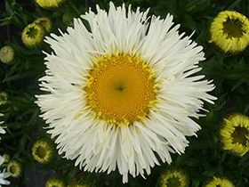 The “Real” collection of Leucanthemums highlights distinctly different varieties with unique flowers. All have a sturdy, upright habit that needs no staking, and all are well branched, producing a great canopy of blooms. 'Real Galaxy' has many layers of fine fringed petals that are pure white in color with contrasting deep golden centers carried on very strong stems. Blooms become fuller with age. These varieties are very floriferous with improved disease resistance. All bloom early to mid summer and then repeat in fall. These are robust drought- and wind-resistant perennials once established. This Shasta Daisy variety is well-behaved with a tight clumping habit.