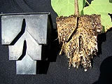 The 25-cubic-inch injection-molded Express 18 propagation container from RootMaker Products Co. has a unique design of angles, ledges, ribs and holes that create 12 chambers. These chambers act as effective “mini-pots” to catch roots and direct them toward openings to create root branching. The Express 18 is a single unit which fits a Shuttle tray allowing individual sorting and handling for grafting.