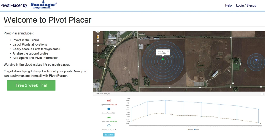 Senninger’s Pivot Placer is a cloud-based portal with easy access to information about your customers’ irrigation equipment - geographical location, field characteristics, equipment manufacturer, model, and date of installation. With just a few keystrokes, you can conveniently track maintenance and service needs. Senninger’s Pivot Placer is accessible from computer, tablet, or smart phone, in the office, the field or even at home.