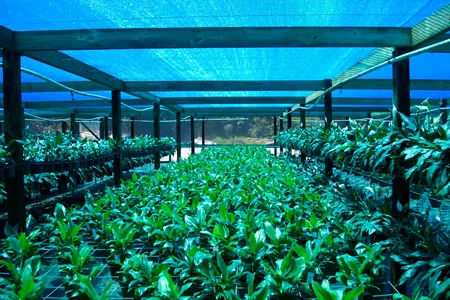 ChromatiNet Blue shade cloth from Signature Supply reduces the spectrum of red and far-red light and increases the blue light spectrum, creating a compact plant with deeper green foliage. Growers can produce and ship more quality plants per square foot using only sunlight. In some varieties it can postpone flowering. The increase in blue light changes the rhythm of the plant. Blue light acts as a natural growth regulator decreasing foliage volume by around 20 percent, darkening the foliage and delaying the bloom.