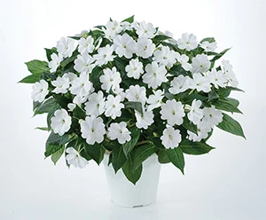 New Guinea Impatiens Sun Harmony White features large bright white flowers against contrasting lively green leaves. Blooms continuously & profusely from early spring to fall. Mounded growth habit and excellent garden performance in sun or partial shade.