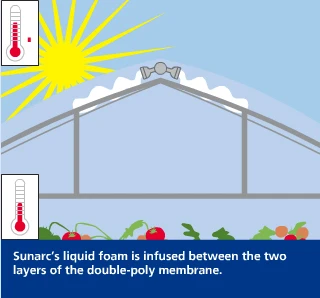 On-Demand Shade System from Sunarc infuses liquid foam into the cavity formed by two layers of double polyethylene covered greenhouses. During the day, the foam mimics clouds in lessening and diffusing energy penetration when solar radiation levels are high. At dusk, the remaining liquid from collapsed foam is drained back into the surfactant reservoirs and recycled to be used again the next day. Sensors ensure automatic production by regulating the operation of foam generators and sprinklers as conditions demand. Software is programmable to local needs and may be monitored and operated by remote computer control. The shade system maintains the thermal equilibrium in a control environment. As a result, optimal temperature conditions during each 24-hour cycle can be maintained year-round.