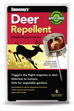 A single application of Sweeney’s Deer Repellent can protect plants for the entire growing season. It uses 100 percent dried blood, a scent-based repellent, to trigger an innate danger response in deer. The non-toxic ingredients produce no noxious smells to humans and is safe to use around children and pets. The repellent is continually released from a repellent station all season long, triggering a deer’s instinct to avoid predator activity. The all season repellent contains six patented repellent stations per unit and six metal stakes. The repellent can be used as a plant and/or perimeter treatment and can be used with the stakes or hanging on a wire.